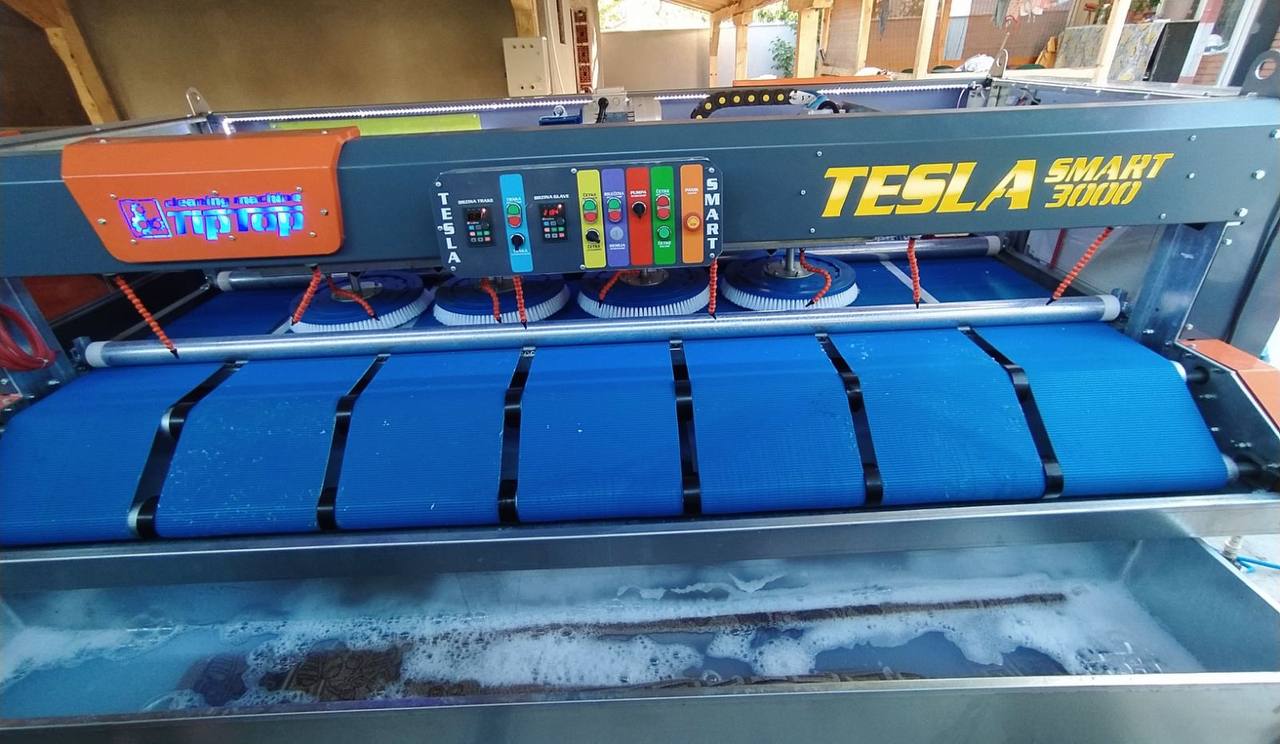 Nakon trešenja, tepih se pere pomoću najsavremenije Tesla Smart 3000 automatske mašine. Ova mašina koristi precizno doziranje deterdženata i vode kako bi se postiglo dubinsko čišćenje, a pritom se pažljivo čuvaju boje i tekstura vašeg tepiha.